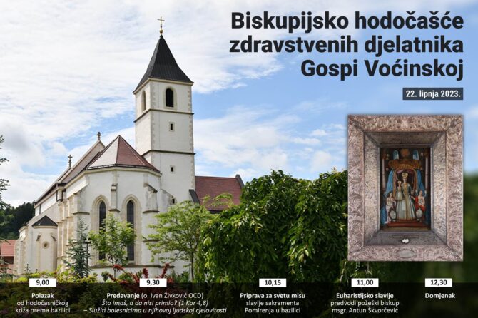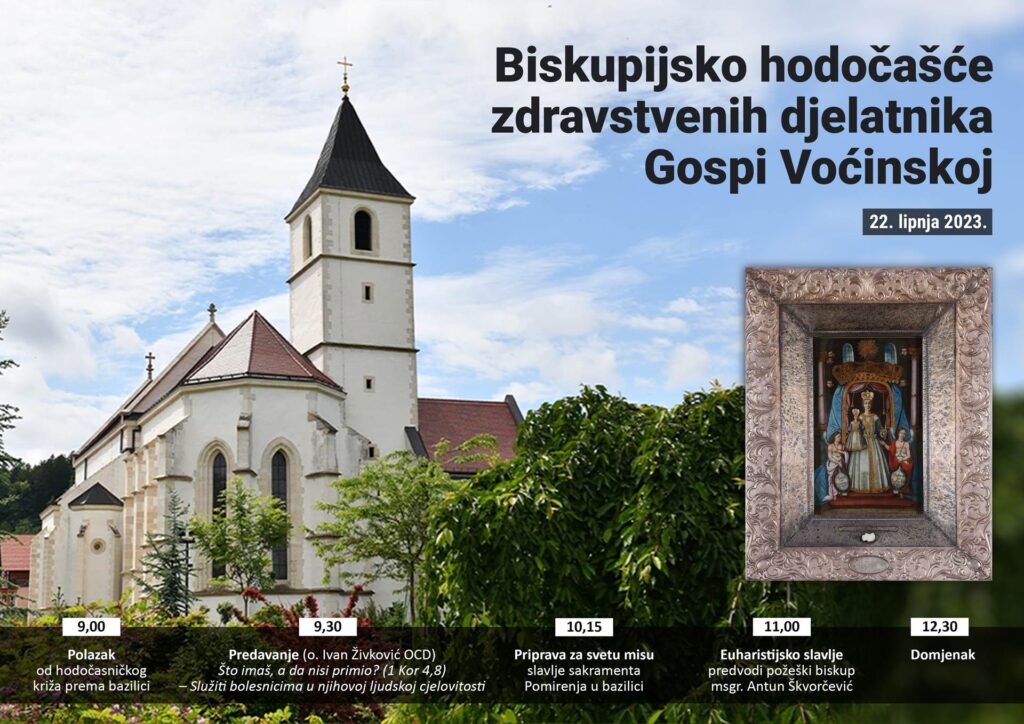 Poštovani djelatnici, obavještavamo Vas da će se tradicionalno Biskupijsko hodočašće zdravstvenih djelatnika Gospi Voćinskoj održati i ove godine 22.06.2023. godine s početkom u 9 sati u Voćinu. Pozivamo Vas da svojim prisustvom podržite ovo hodočašće. Program hodočašća prilažemo u prilogu. Za odlazak u Voćin potrebno je samostalno organizirati prijevoz.