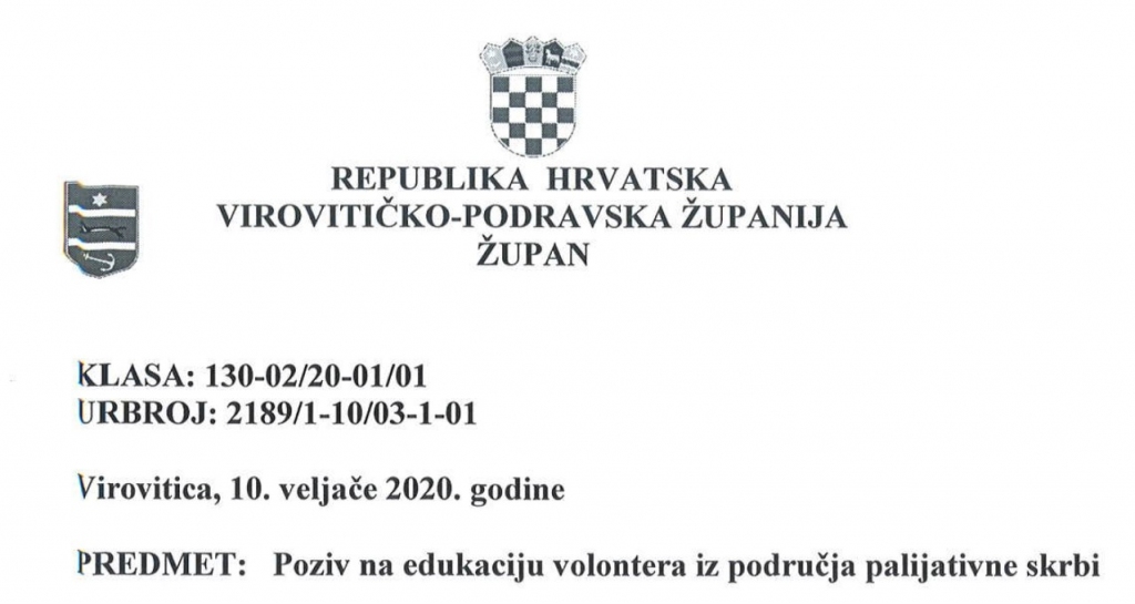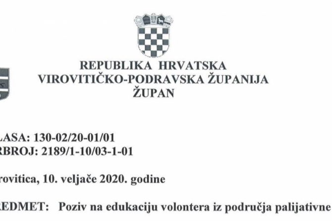 Virovitičko-podravska županija u sklopu projekta ” Razvoj palijativne skrbi u Virovitičko-podravskoj županiji ” organizira edukaciju za sve zainteresirane koji žele postati volonteri iz područja palijativne skrbi. Volonteri pružaju praktičnu pomoć i podršku ljudima oboljelim od terminalne bolesti, te njihovim obiteljima. Pozivam sve zainteresirane zaposlenike naše bolnice da se prijave Pomoćnici ravnatelja za sestrinstvo Lidiji Knapić, dipl.med.techn. najkasnije do srijede 19.02.2020. godine kako bi na vrijeme dobili potrebne informacije o volontiranju i potrebnoj edukaciji. Nakon završene edukacije svi će polaznici dobiti potvrdu o stečenim kompentencijama iz područja palijativne skrbi.